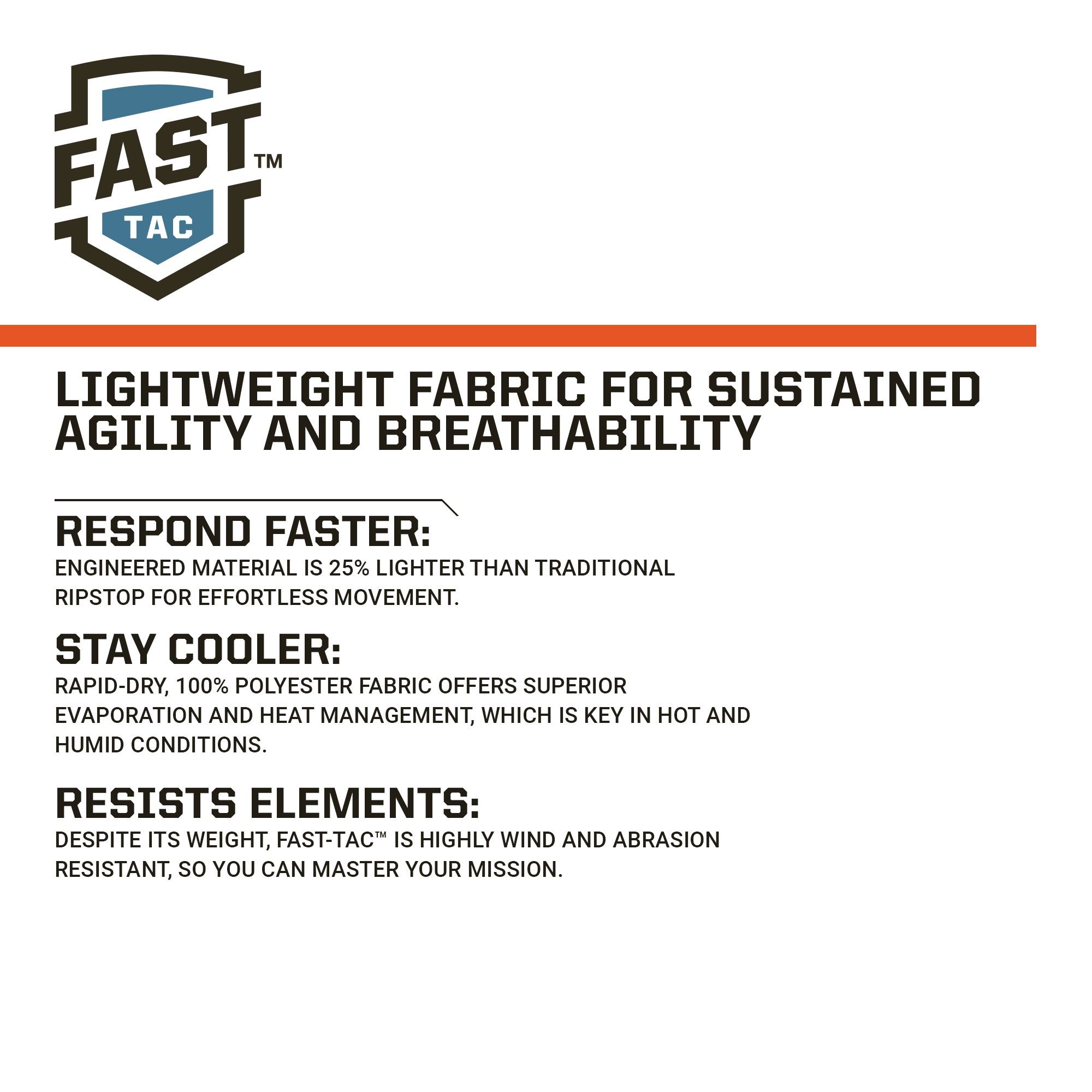 - Built from 4.7 oz. FAST-TAC™ Polyester Ripstop Fabric