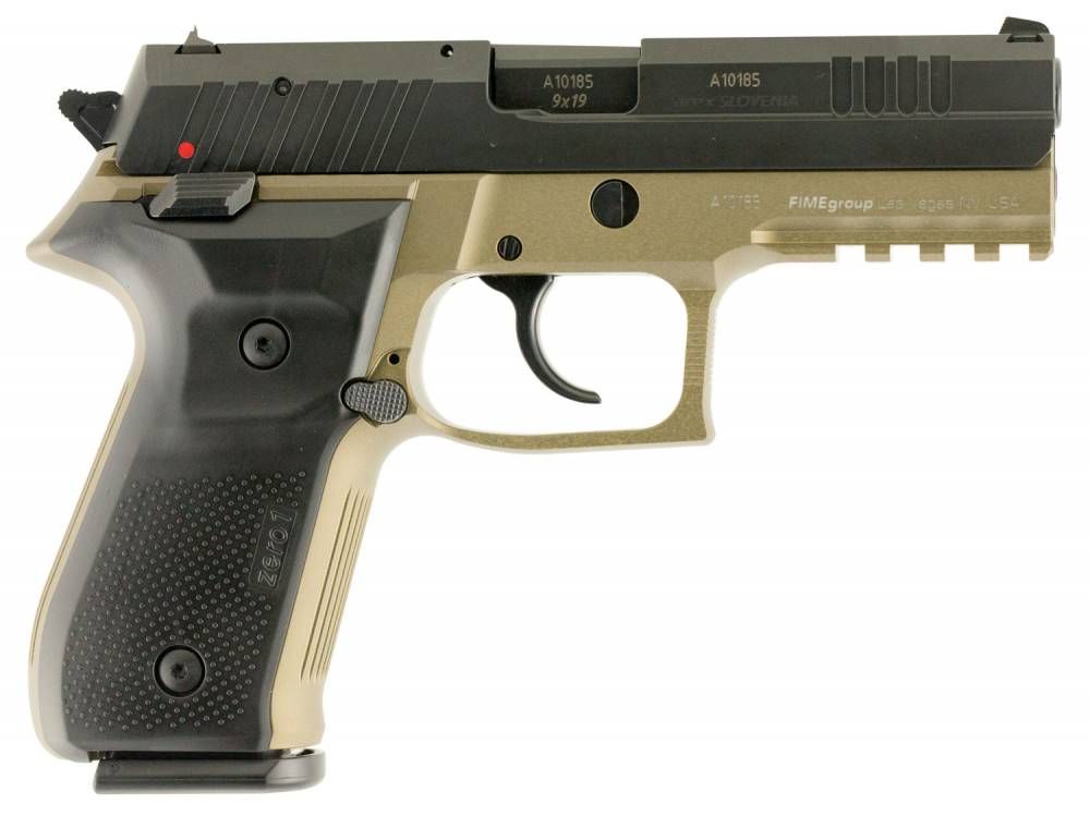 Arex's Rex Zero 1 pistol complies with strict military standards for reliability. Its frame is constructed of T7075 aluminum with steel locking block inserts and a hardcoat anodized finish. The nitrocarburized slide and cold hammer forged barrel are made from solid steel. The Rex Zero 1 has high profile white dot sights, ambidextrous safety, loaded chamber indicator, full length slide rails, and a large trigger guard for the use of gloves. This standard size model has an FDE frame with black grips, a black slide, and a 17-round magazine capacity.