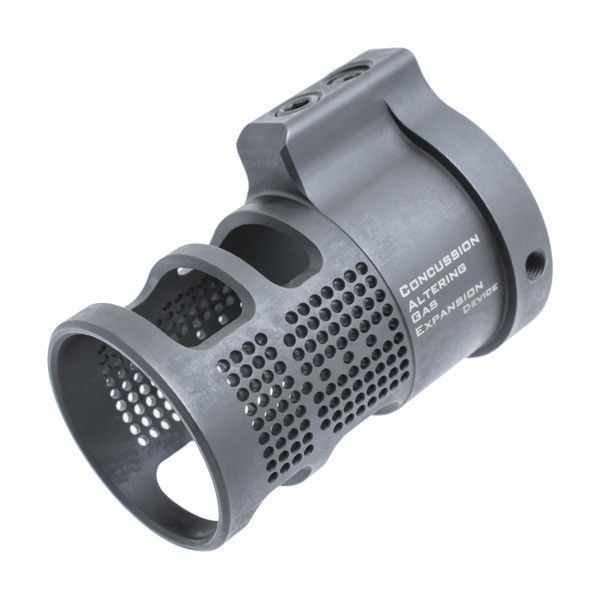 The CAGE does not use a large tubular construction because gas dynamics used for muzzle brakes do not operate efficiently when transferring energy into them. Instead it features a close wrap fit. This allows the CAGE to distribute the gases in a manner conducive to both muzzle control and concussion disruption.