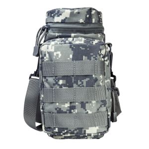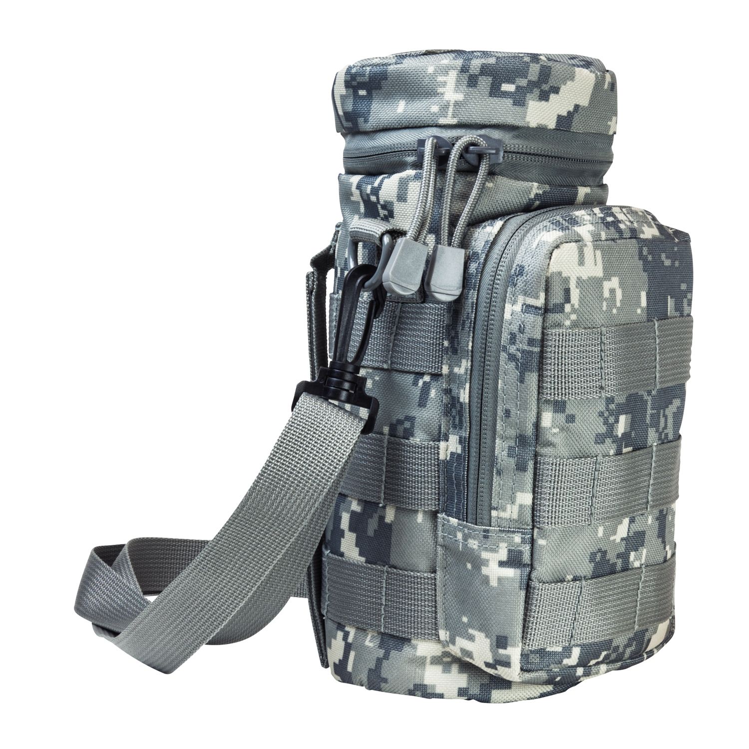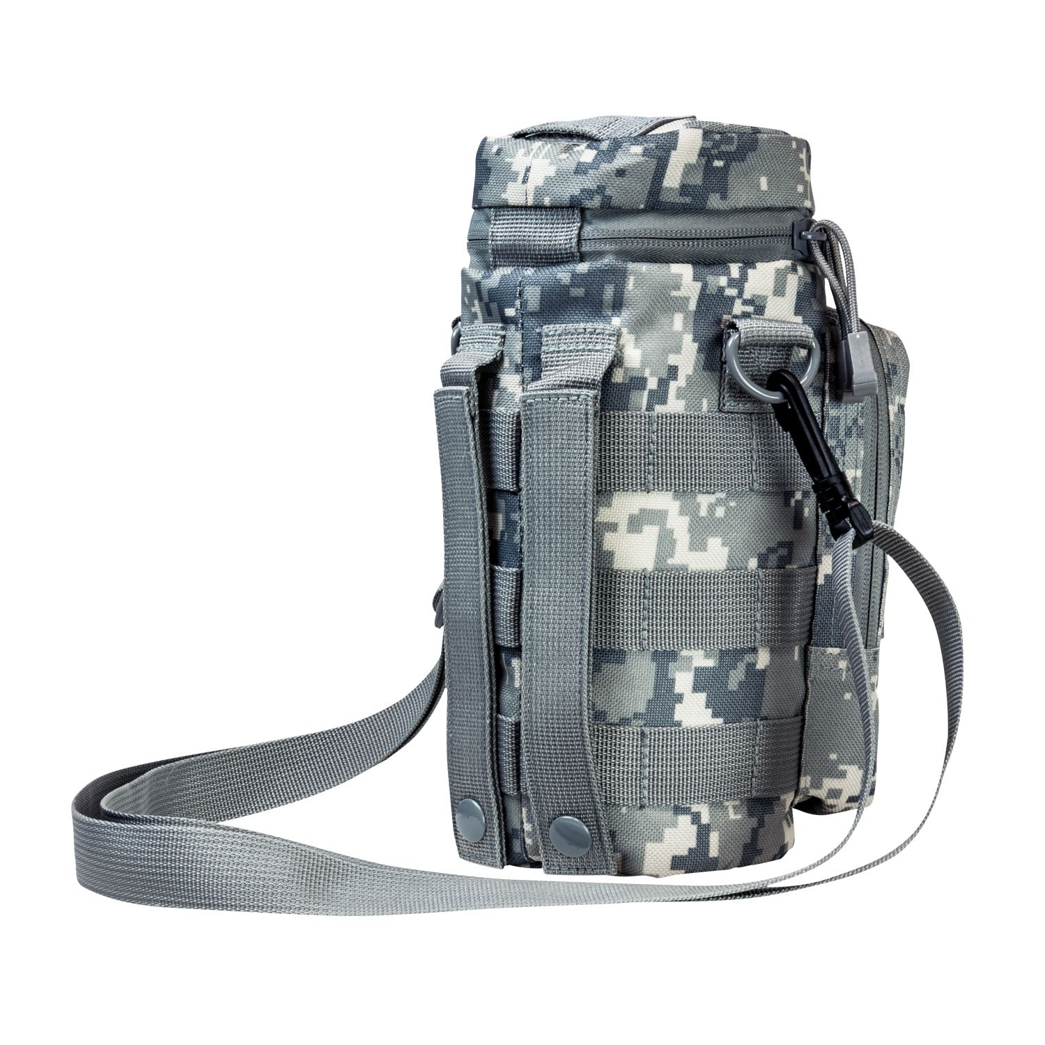 - The New VISM MOLLE Hydration Bottle Carrier will hold up to 32oz. bottles. Zippered top lid and a pass through hatch for drinking tubes. Three rows of MOLLE webbing completely around the Hydration Bottle Carrier. Drain Grommet located on the bottom of the Bottle Compartment.