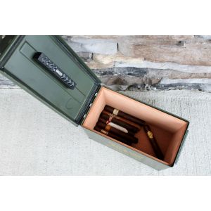 The 50 is the best selling ammo box humidor! It’s patent pending and built using a .50 cal/5.56 size M2A1 ammunition can – just like the original Ammodor back in 1998. Holds 100-125 robusto size cigars and has plenty of room for sticks of all sizes.
