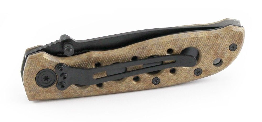 • 3.2 in. 7Cr17 high carbon stainless steel blade with 4.2 in. desert tan aluminum handle. Inlcudes thumb knob, and liner lock.