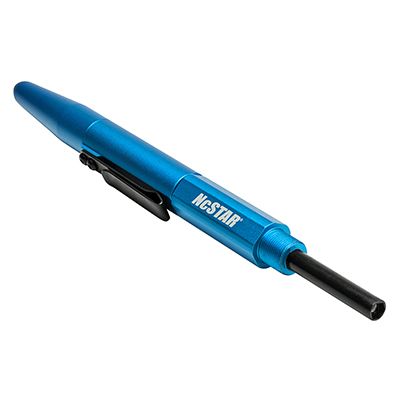 • Anodized blue aluminum pen tool with two threaded caps that thread into the center body, with a black steel pocket clip.