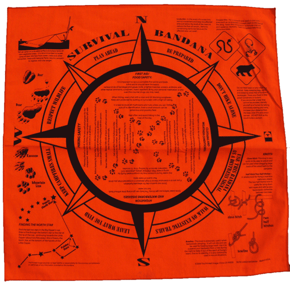 The 5ive Star Gear® Survival Handkerchief/Bandana provides basic survival information including setting up a campsite, finding the North Star, some basic knots, hiking safety, first Aid, food safety, clothing and weather conditions, hydration and waterborne diseases, animal tracks, bear safety, snake and scorpion bites. This is an essential item for any hiking or camping trip that is a large size and bright orange color making it perfect to carry in case you need to signal for aid, and the information printed on it may just help you in a wide variety of emergency situations.;