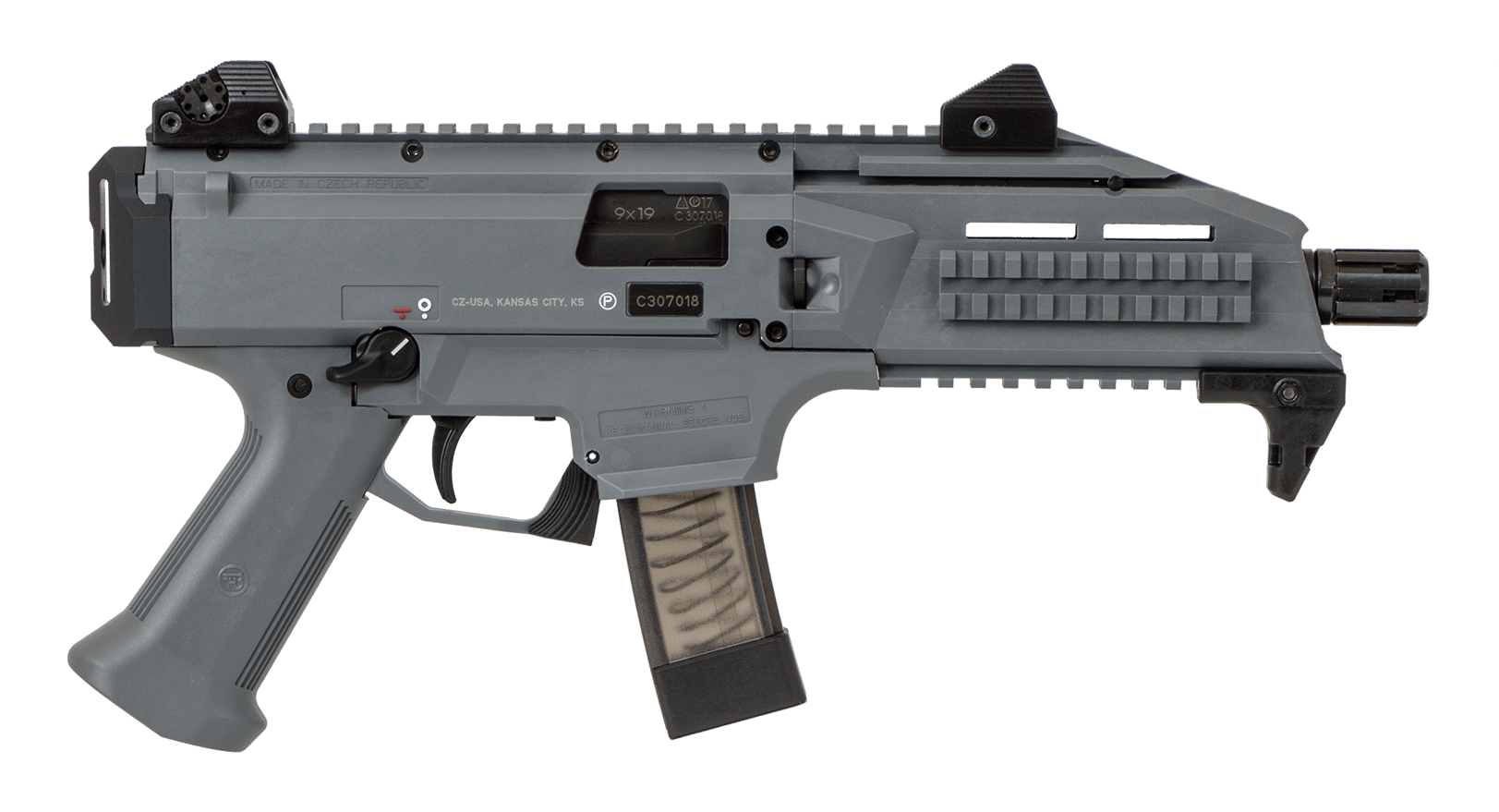 Imported as a pistol, it is a blowback-operated semi-auto in 9mm with a short 7¾” barrel. Equipped with CZ's newly designed low-profile sights, its rear sight has four different aperture sizes for everything from close quarters to way out there. The sights ride on an 11” Picatinny rail perfect for mounting optics. Starting in 2016, Scorpion Pistols feature 1/2×28 threads hidden underneath the factory flash-hider, meaning users can fit either 1/2×28 or 18×1 accessories to the muzzle. Also added is a QD sling swivel pocket integrated into the rear sling attachment point.