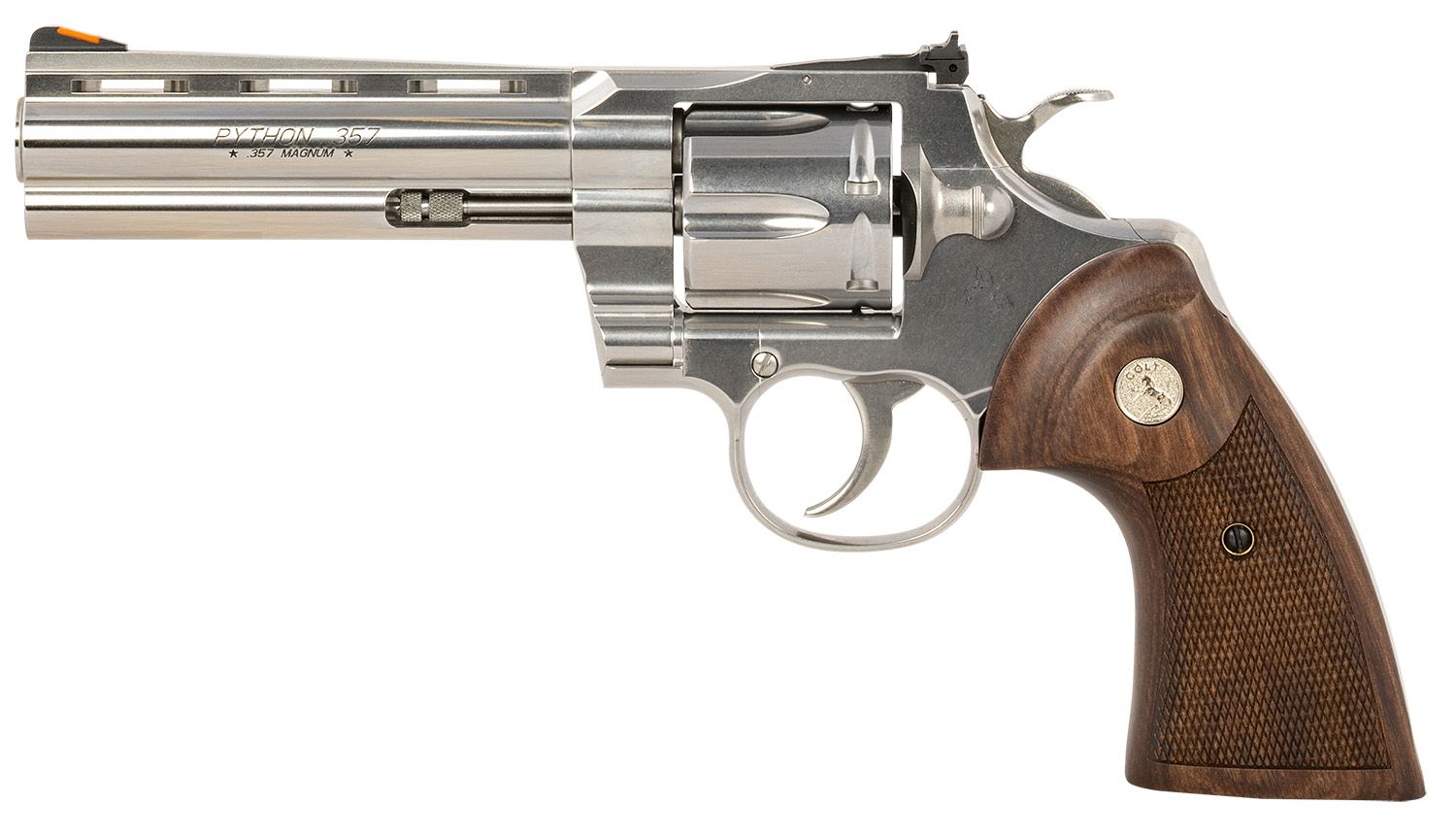 Colt Python 357 Mag/38 Special 6 Shot 5" Stainless Recessed Target/Vent Rib Barrel, Stainless Cylinder & Frame, Walnut w/Colt Medallion Grip