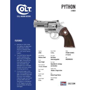 The python features modern stainless steel alloys and a re-designed rear sight.Thirty percent more steel beneath the rear adjustable target sight gives you a stronger revolver and more robust shooting experience.A recessed target crown, user-interchangeable front sight, and walnut grip with the iconic colt medallion make this a gun you'll want to shoot and show off.The python is chambered in.357 magnum and also accommodates 38 special cartridges.