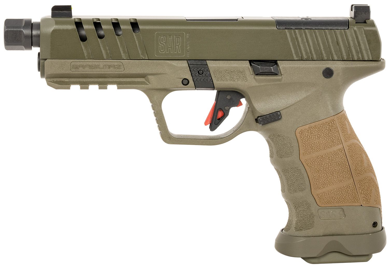 SAR USA SAR9 SOCOM 9mm Luger 17+1/21+1, 5.20" Black Steel Threaded Barrel, Special Forces Green Optic Ready/Ported/Serrated Steel Slide, Special Forces Green Polymer Frame w/Picatinny Rail, Tan w/Interchangeable Backstraps Grip