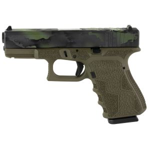 The GLOCK 19 in 9 mm Luger is ideal for a versatile role thanks to its reduced dimensions when compared to the standard sized option. In addition to its use as a conventional service pistol, it is ideal for use as a backup weapon or for concealed carry purpose. This Shark Coast Tactical Glock 19 is custom cerakoted with a Olive Drab Green frame and a Black Multicam slide. Their Glock 19 features a custom laser engraved frame and an optic cut slide for RMR footprint red dots.