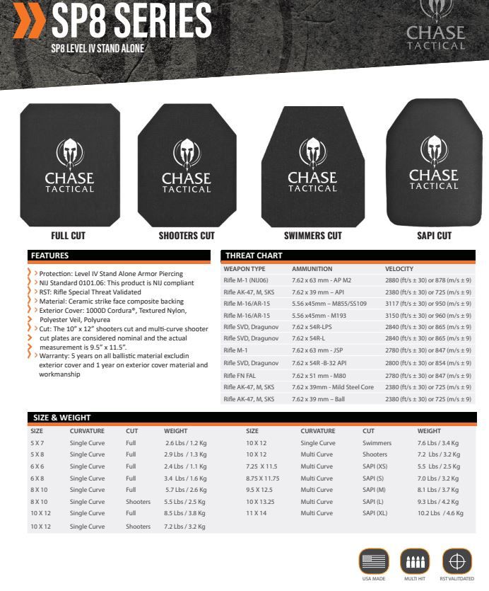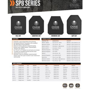 The Chase Tactical SP8 Level IV Rifle Armor Plates are NIJ 0101.06 Compliant Stand Alone Plates. The SP8 Hard Armor ballistic insert provides protection against projectiles, shrapnel and improves the performance of ballistic vest and tactical EOD search suits.