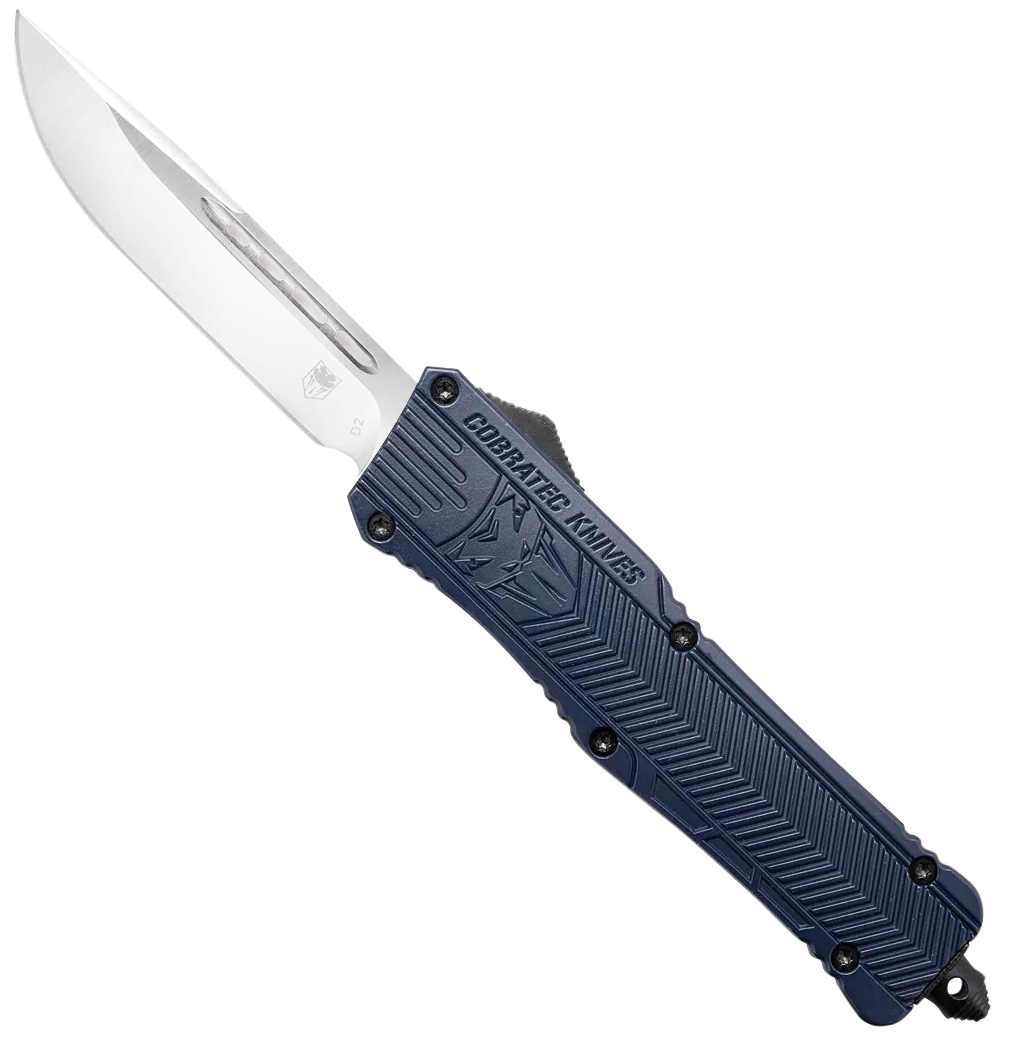 CobraTec Knives CTK-1 Large 3.75" OTF Drop Point Plain D2 Steel Blade/NYPD Blue Aluminum Handle Features Glass Breaker Includes Pocket Clip