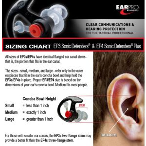 EP3s are available in small (S), medium (M), and large (L). Proper size is based on the dimensions of your ear's concha bowl. Size "medium" fits most people; however, to ensure the best possible fit, review the earpiece sizing chart below.