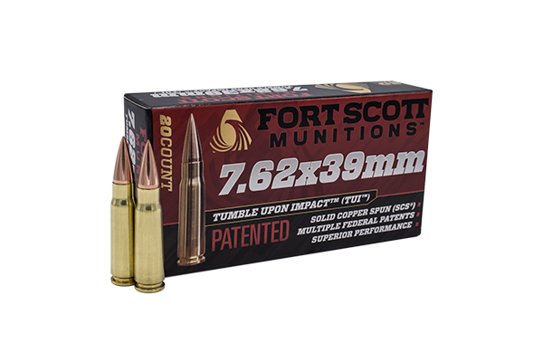 Fort Scott Munitions 7.62x39 combines precision with the reliability of the AK platform. Capable of sub-MOA groups at 100 yards, our match grade solid copper 7.62x39 TUI™ projectiles are all precision machined and loaded with the utmost care to bring you some of the tightest tolerances in the industry when it comes to factory loads. Each round is also engineered with our multi-patented Tumble Upon Impact™ technology, giving you one of the most lethal match grade hunting rounds on the market.