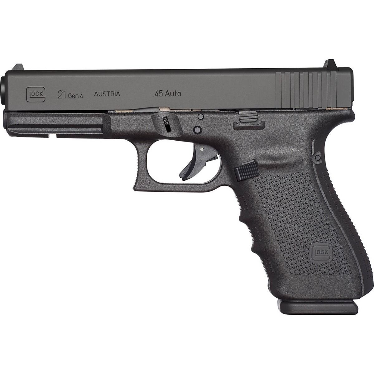 Reliability and simplicity have made GLOCK® semi-automatic pistols a favored sidearm for law enforcement, military, and civilian use all over the world. The GLOCK 21 Gen4 Semi-Auto Pistol is a full-size service pistol, shooting the .45 ACP pistol cartridge, a standard military round for over 100 years with proven knock down power. The Gen4 Semi-Auto Pistol utilizes a dual recoil spring assembly that substantially increases service life of the pistol, and helps take the snap out of recoil, reducing muzzle flip for faster follow up shots. A modular back strap allows shooters to instantly customize the grip to an individual shooter's hand size, or to cold weather gloves. Rough grip texturing on the Gen4's polymer frame provides a sure hold on the pistol when hands are wet or sweaty, and the enlarged magazine catch is reversible, accommodating left- or right-handed shooters. An integral accessory rail in front of the trigger guard allows for the attachment of a plethora of aftermarket tactical flashlights or laser sights. The dovetailed rear sight is drift adjustable and has a white outline around its notch; the fixed front blade has a white dot. Sight acquisition is quick in any light. The GLOCK 21 Gen4 Semi-Auto Pistol is an ultra-reliable handgun that is easy to learn how to operate and maintain, making it an ideal choice for self-defense, whether it be for field carry, home defense, or bear protection in the back country. The model 21 Gen4 comes with three standard 13-round magazines, or three 10-round magazines that comply with various city or state restrictions on magazine capacity.