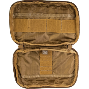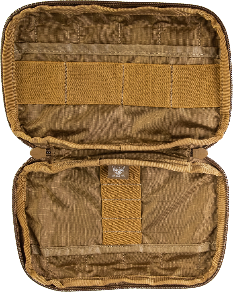 Our latest Admin Pouch Enhanced is now thinner and made from Laminate nylon, which means it's lighter and more streamlined than ever before! Attaches to modular webbing with the two included Malice Clips. The front of the pouch is covered in modular webbing as well as loop material for attaching name tapes or patches. The interior features a pocket and multiple elastic loops for storing smaller items like pens, lighters small multitools and batteries. The adjustable cord allows the pouch to open completely or as a desk while a heavy duty dual pull zipper keeps things secure. Available in Black, Coyote Brown and MultiCam.