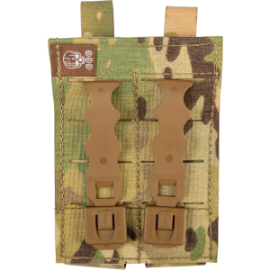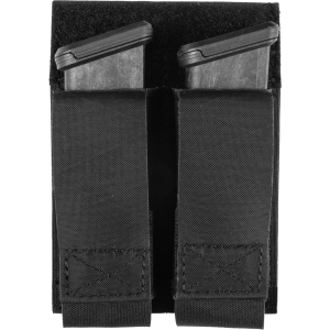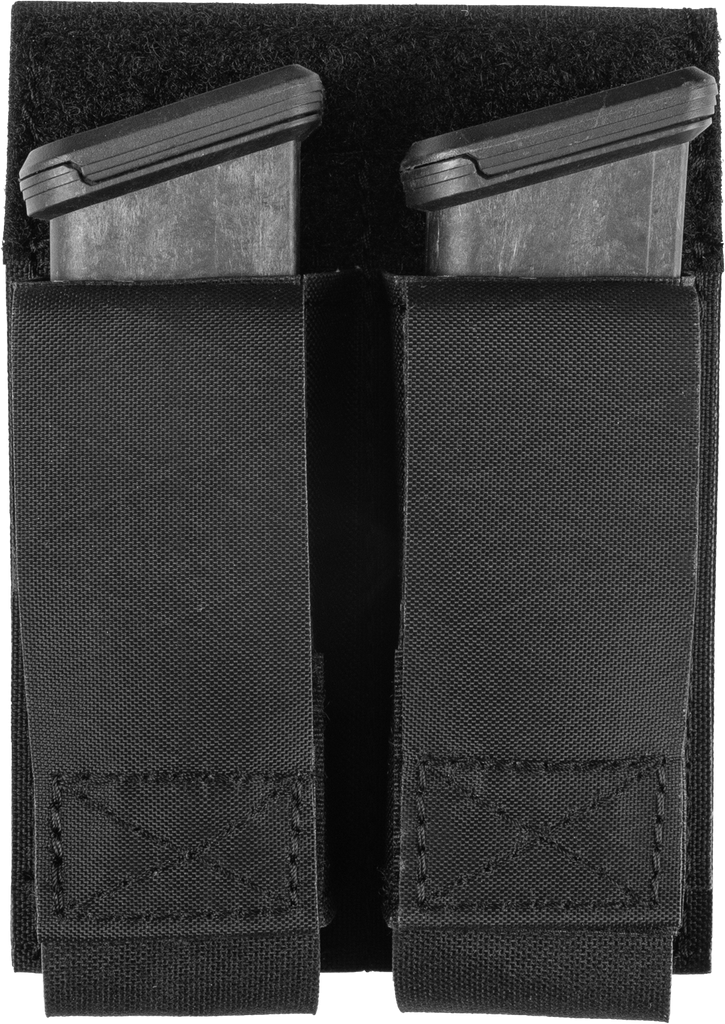 Our Double Pistol Magna Mag Pouch now featured laminate nylon, and will hold two pistol magazines securely with flaps open or closed. It will hold most single or double stack pistol magazines and also features strong, rare earth magnets to help lock metal magazines inside the pouch. Hook and loop fasteners secure the flaps open or closed. The pouch attaches to any MOLLE/PALS style webbing with the two included Malice Clips.