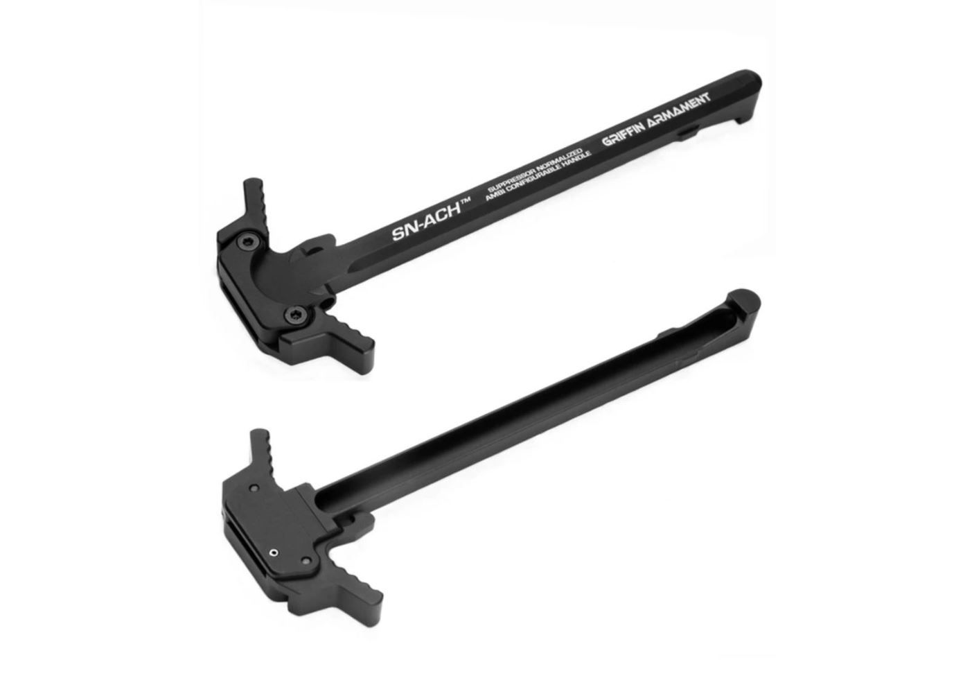The SN-ACH features a gas check groove and a suppressor gas vent that reduces gas in the face of the shooter when using a suppressor. Configurable levers were also added so that a user could choose to run the included large lever, which works with gloved hands, or purchase and modularly use the smaller levers (available separately) without having to buy an entirely new handle at a excessive cost. The bolt carrier engaging hook features durable reinforced geometry for 30% increase in strength over milspec handles and approximately 3 times as strong as inferior 6061 handles which routinely break under hard use. Fitment bearing surfaces on the handle mating ensures reduced wobble fitment with the AR15 and AR10 upper receiver. The handle is made from 7075-T6 aluminum and hard coated for optimal wear resistance- the Griffin SN-ACH is the finest charging handle available for the AR series family of firearms.
