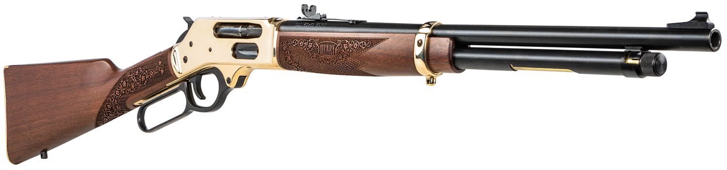 Henry Side Gate Lever Action 45-70 Gov't, 20" Brass Receiver, Walnut Stock, 4rd, Fully Adjustable Semi-Buckhorn Sights