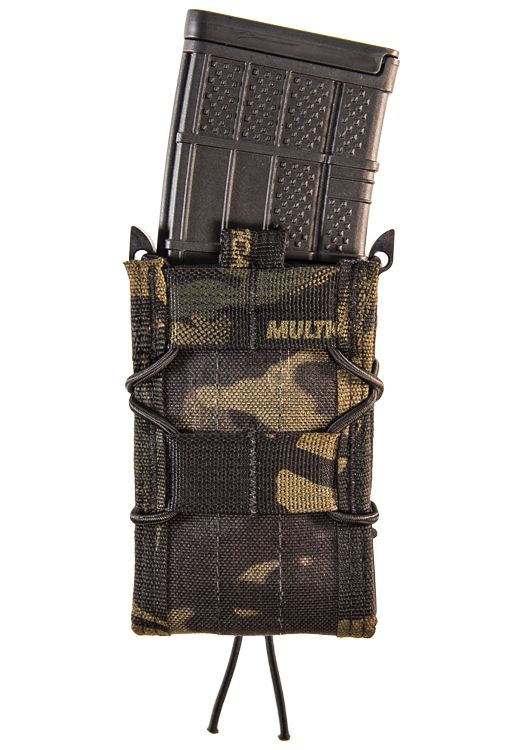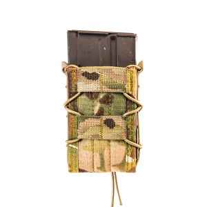 This unique pouch uses injection molded polymer sides, Cordura™ front and back, and shock cord lacing to lock just about any rifle magazine into place. USGI, HK, PMAG, ARC, FAL, AK 30/ 40, LR20 and M14 magazines are all held securely and deployed easily and silently on demand.