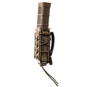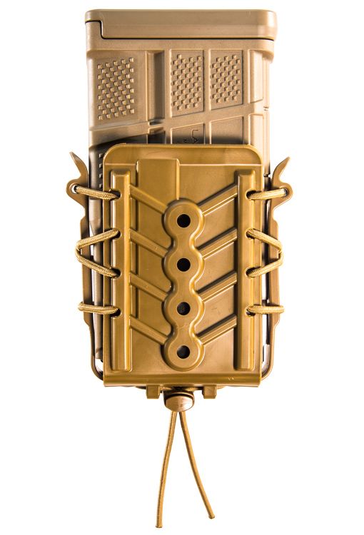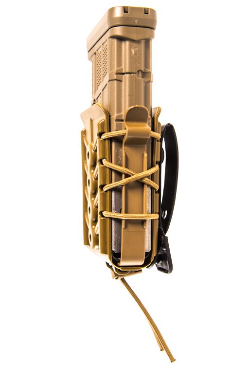 The body and brackets are made with our durable and flexible, proprietary polymer and are laced together with bungee cord for the same versatility customers have come to expect from the TACO® brand. As with the originals, these pouches grip and retain a wide variety of magazine styles and calibers.