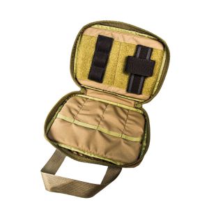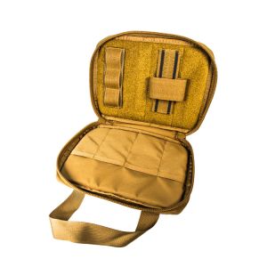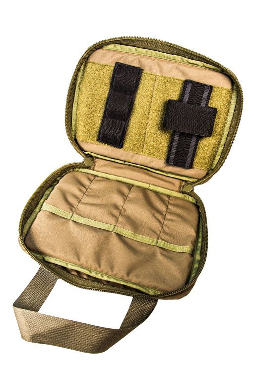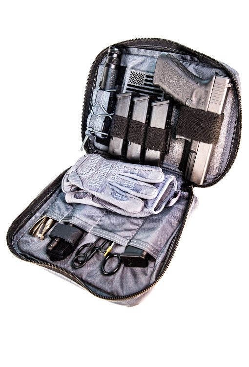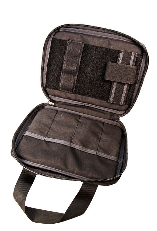 Constructed of 500D Cordura®, the internal Velcro® loop wall, gripper elastic retainers, and four pockets provide superior versatility. This inclusive set up provides stable organization and storage for your handgun, several magazines and other tools/items, such as cleaning kits, multitools and flashlights.