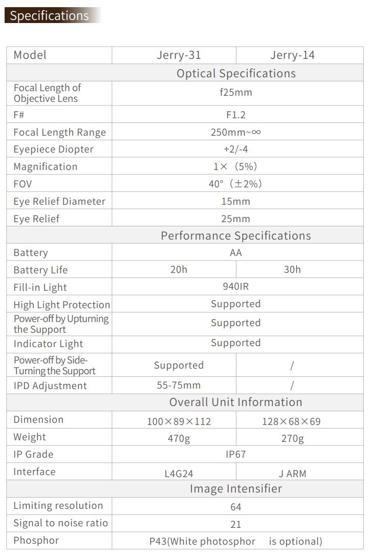 Jerry-31 binocular night vision goggle uses super Gen2 low light tubes. These are the most affordable white phosphor night vision goggle on the market. It is packed full of features including manual gain, IPD stops, independent tube power on/off, IP67 and weighs only 470 grams / ~16 ounces.