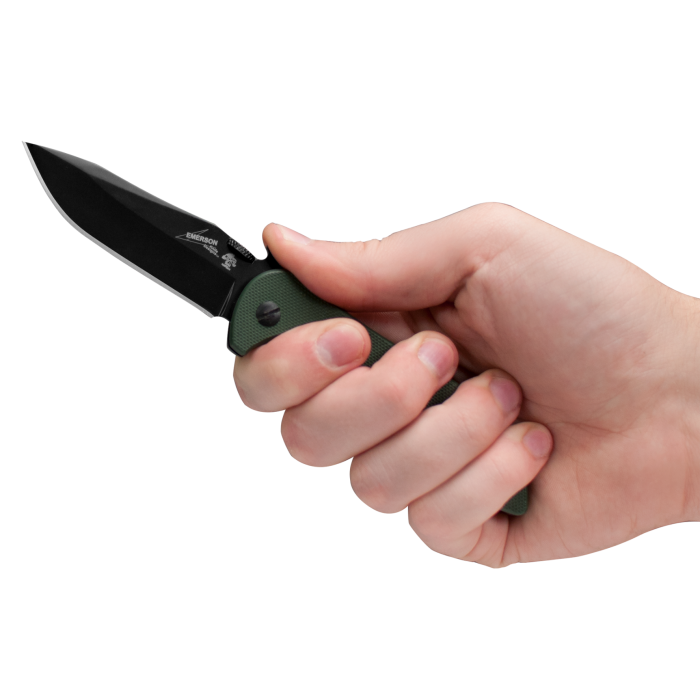 This right-sized Kershaw-Emerson looks great in olive drab. Kershaw Knives and Emerson Knives have joined forces on a series of knives that combine the precision engineering of Kershaw with Emerson's uncompromising functional design. The CQC-5K features a modified clip-point blade for versatile cutting capability. Black-oxide coating protects the blade and makes it non-reflective, too. G10 handles in olive drab provide secure grip and a locking liner means safe and solid blade lock up.