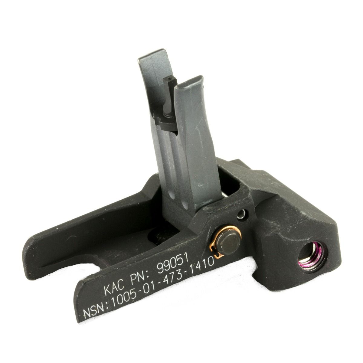 Originally designed for the US military's SOPMOD rifle enhancement program, the KAC M4 Folding Front Sight is a low profile backup sighting solution that is designed to be attached to the top rail of a rifle's handguard. When stowed in the folded position, the M4's sight base extends back to envelope the front sight leaf on the right and left side, helping to protect it from damage.
