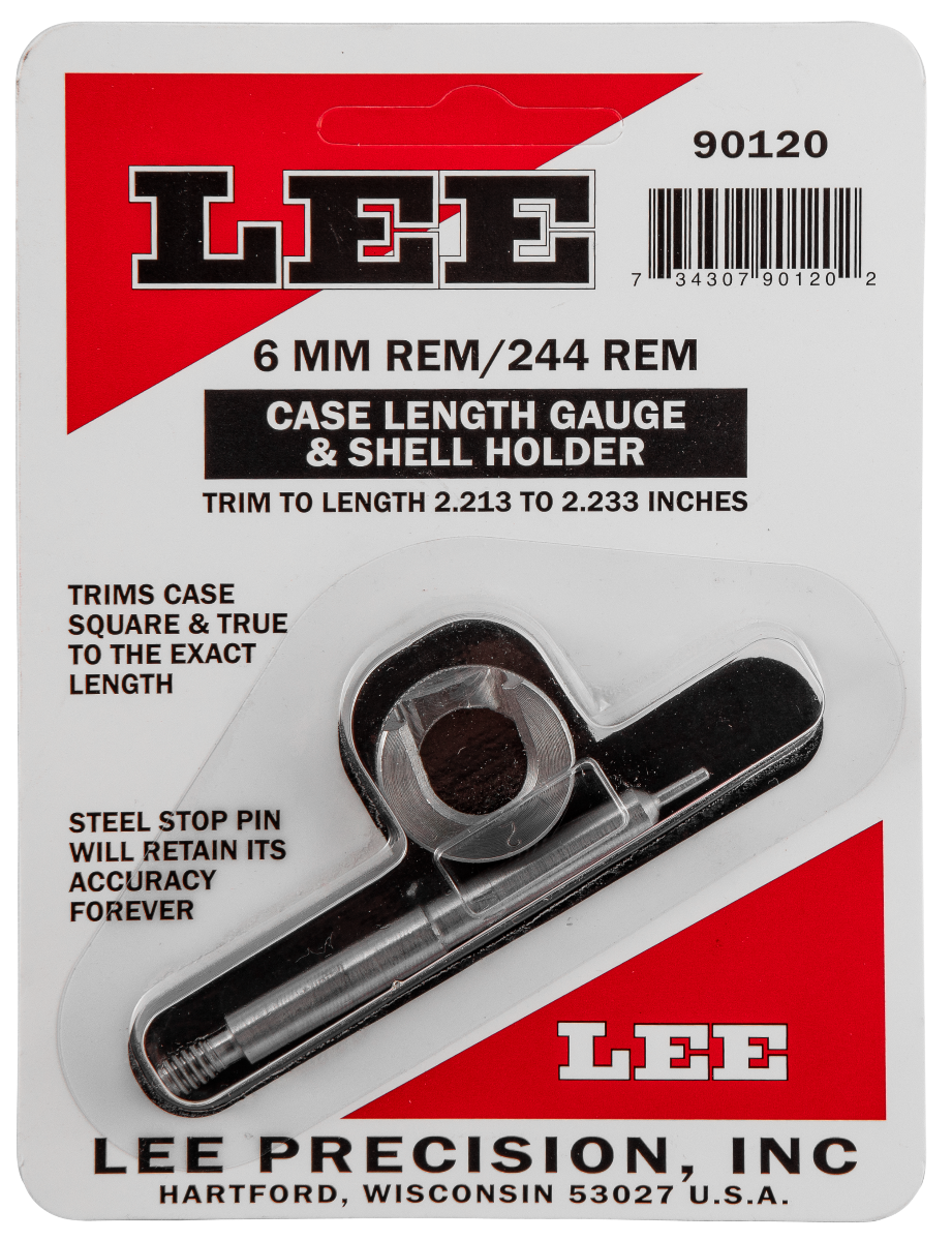 Lee 6mm rem / 244 rem case length gauge is a precise, easy way to trim to length and square the case mouth.Used with the cutter and lock stud or zip trim.Trim to length 2.213 to 2.233 inches.