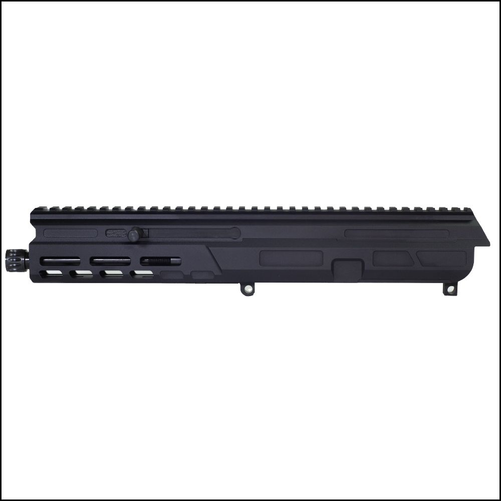This upper receiver is side-folding compatible and features Matador Arms® patent-pending EZTS “Easy Take-down System” with no tools required to break down the upper for maintenance and cleaning. The 9mm upper is machined for maximum weight reduction, slim profile, and compatibility with bolt catches and lower receivers. The upper is also built with a tapered multi-material 4-piece trunnion system to maintain mechanical accuracy and durability.