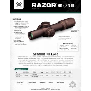 The next evolution of our wildly popular Razor line, the Razor HD Gen III 1-10x24 brings the highest level of first focal plane performance to those who demand the versatility of 1-10x power. Military, law enforcement, and competition shooters alike will love the clarity of an HD optical system and a crisp, illuminated reticle in a package that weighs the same as our 1-6x, but doesn’t sacrifice any durability. A true 1x on the low end and daylight bright illumination for reliable performance in all conditions makes this a single solution for close-quarters and long-range.