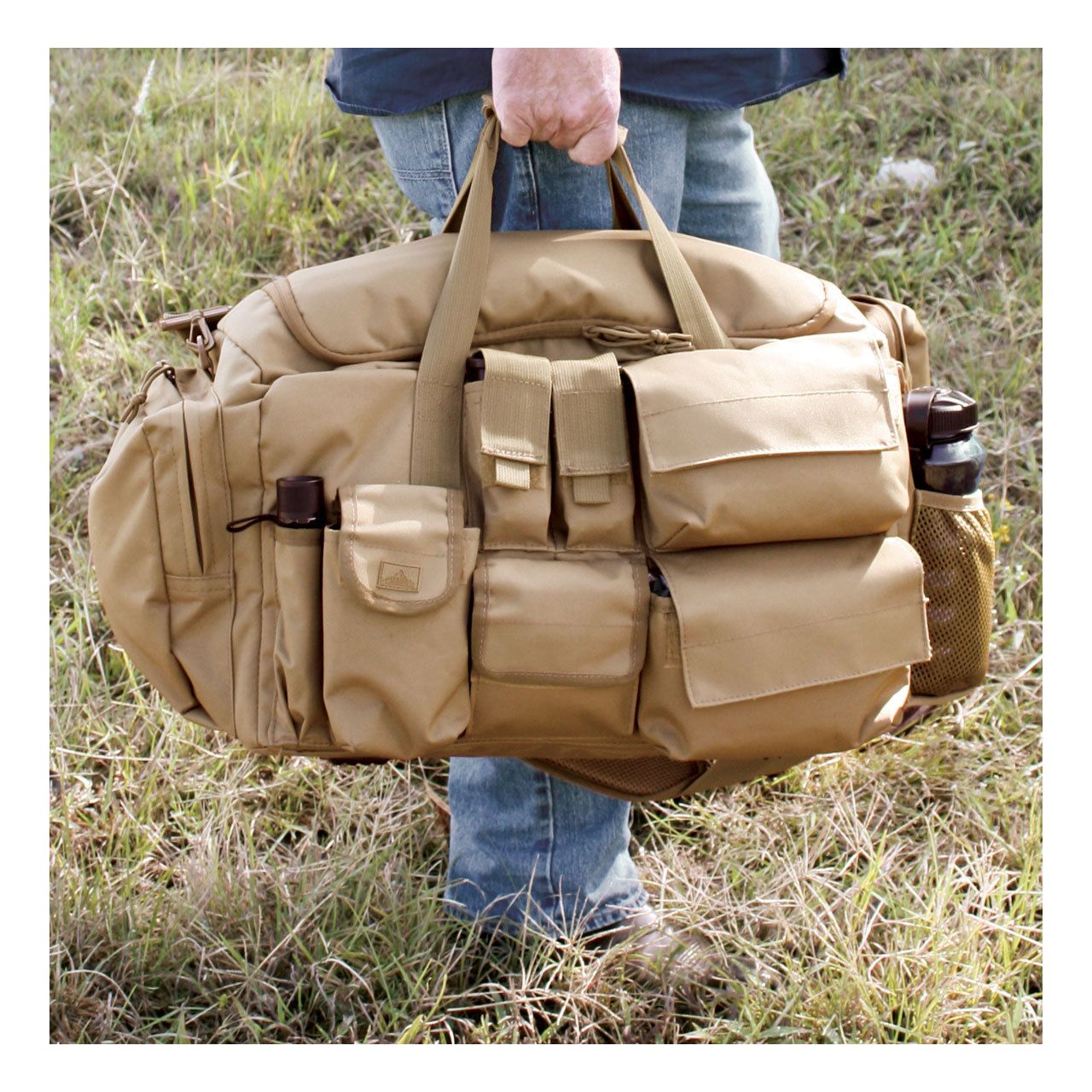 Two removable touch-fastener padded dividers split the 43 liter main compartment. The seven external utility pouches are ideal for items like ammo, first aid, or radio equipment. The included padded shoulder strap is adjustable and removable. Interlocking carry handles offer an alternate way of toting this duffle bag.