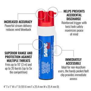 The locking safety on the top of this SABRE pepper gel with clip helps guard against accidental discharge. Because gel doesn't atomize like traditional pepper sprays, wind blowback is practically eliminated. This gel has a range of 12 feet, providing you extra distance and safety.