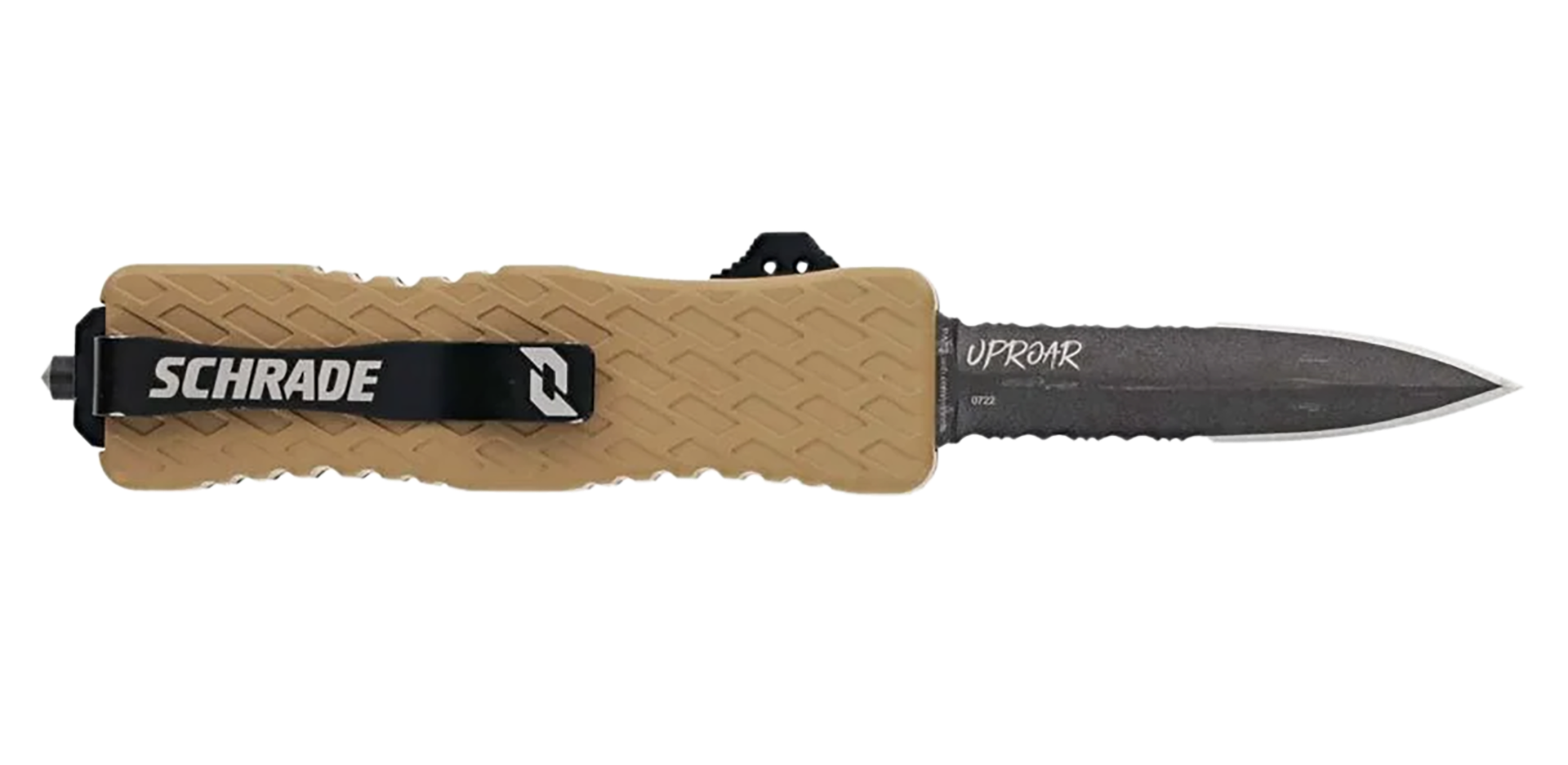 Schrade Uproar Automatic 3" OTF Dagger Part Serrated Black Oxide D2 Steel Blade, Flat Dark Earth Textured Aluminum Handle