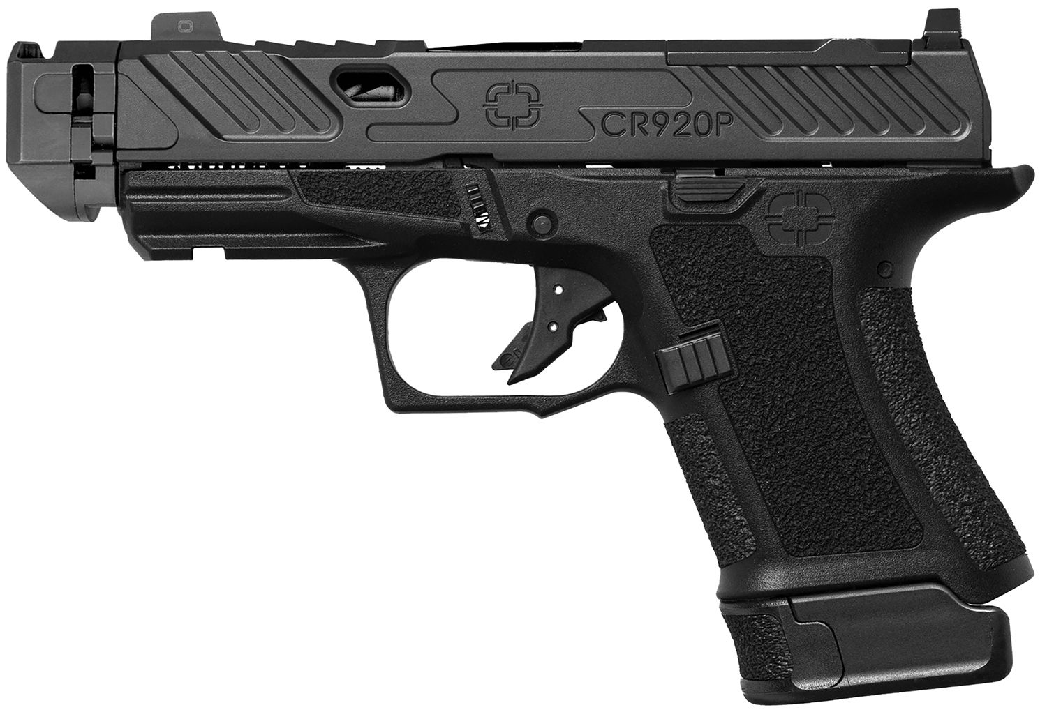 The compensator will significantly improve shot-to-shot times and lessen felt recoil. The CR920 comes features an aggressively textured wrap around frame; extended magazine baseplate features the same texture on the front, to allow an extra tacky point of contact for the pinky finger; directional serrations in the front, rear and topside serrations and a weight-optimizing window cuton the slide; steel sights feature a blacked out serrated rear and a bright green tritium front; match-grade, spiral-fluted. compensated barrel; stainless steel guide rod and a drop-safe, flat-faced trigger;multi-footprint optic cut.