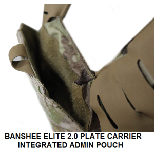 The front of the BANSHEE ELITE is feature packed. On the top of the front of the carrier is an Integrated Admin Pouch now with a zippered gusseted pocket to secure items This admin area allows for storage of small items, tools, batteries, chem lights etc. On the front of the carrier on each side are 2 vertical nylon sewn strips to accomadate QASM buckles to accommodate chest rigs. The front flat closure stops at the bottom and does not run under allowing for fast easy donning and doffing.