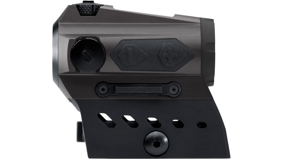 The ROMEO4c has an advanced solar mode of operation. The sight is designed to operate with manual illumination control by pressing the (+) button to increase or the (–) button to decrease the LED dot brightness. However, if the sight is used in bright sunlight the solar cell will increase the brightness of the dot accordingly. One additional feature of the solar model is that the sight will operate in daylight with a completely dead battery.