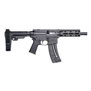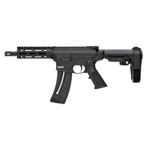 The M&P15-22 Pistol features a M&P handguard with M-LOK slots, 2 position safety, SB Tactical SBA3 adjustable arm brace, and a full length Picatinny-style rail. It utilizes a one-point QD sling swivel attachment point and a threaded barrel with a flash suppressor. Included is one 9mm 25-round magazine.
