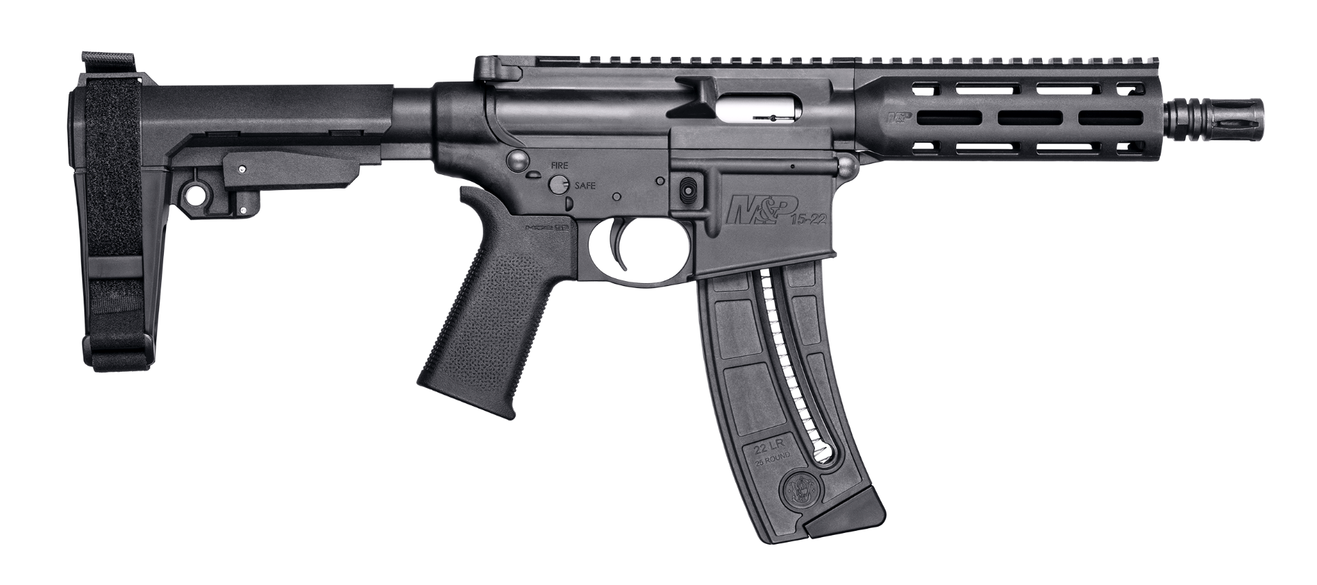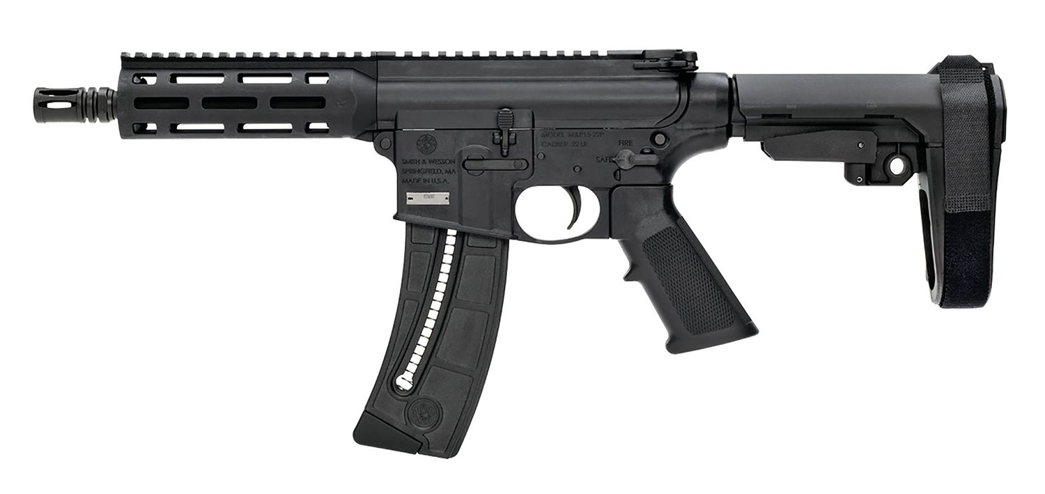 Smith & Wesson M&P15 Pistol 22 LR 8" Black Carbon Steel Barrel 25+1, Black SB Tactical SBA3 Adjustable Arm Brace Stock, Black Magpul MOE Grip, Manual Safety, Optics Ready