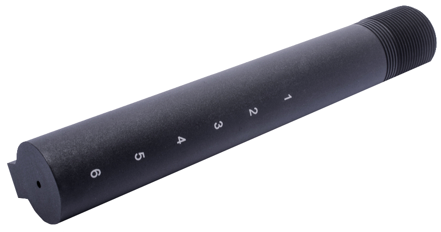 Spike's Tactical Mil-Spec 6-Position buffer tube with dry film lube is machined from 7075-T6 aluminum. This model has a black hardcoat anodzied finish.