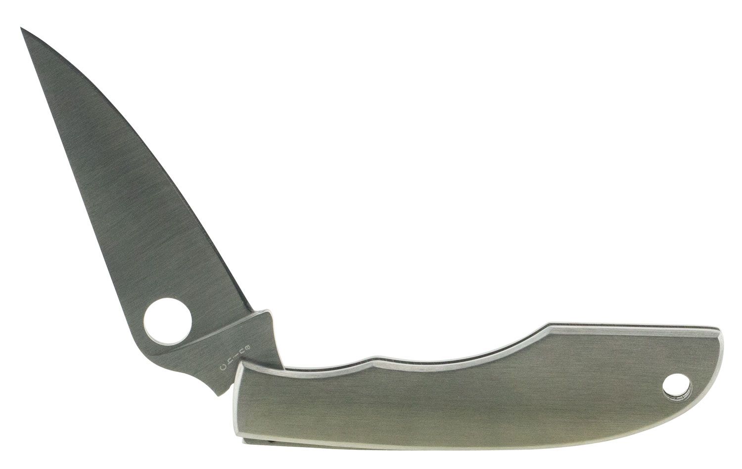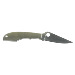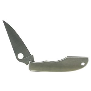 The GrassHopper's size is closest to that of a true penknife with its blade over 2". Its plain edge, Cr13 stainless steel blade stays open when you're cutting, held by resistant pressure at the knifes pivot area. GrassHopper handles are chamfered with no squared-off edges to dig or bite into a gripping hand. The handle is also stainless steel with a laser-engraved Spyderco bug and enough blank area for a small amount of engraving or customization as jewelry or a gift item. Handle lanyard-hole welcomes a chain for wear around a neck or a keychain.