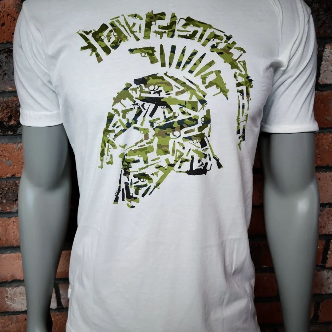 Tactical Shit "Tactical Spartan Helmet"-White T-Shirt-Woodland Camo Decal