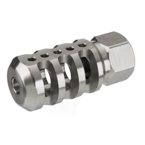 The Accu-Tac Tank ll Muzzle Brake is precisely CNC machined to exact tolerances and heat treated to withstand intense use. The Tank ll releases gases forward and to the sides to reduce muzzle rise and improve accuracy for faster follow-up shots. Full auto fire is possible with massively reduced recoil and muzzle climb, meaning that all shots fall on target. Decreased muzzle blast gasses mean that flash signature is also reduced.