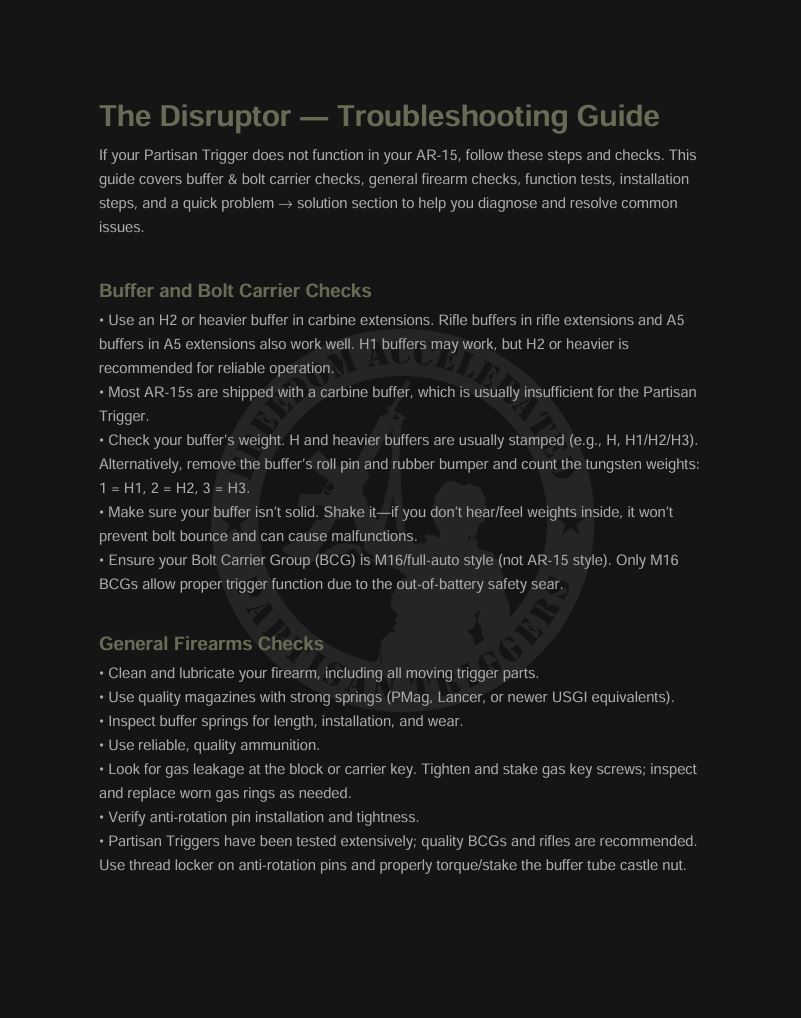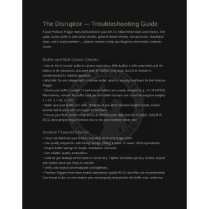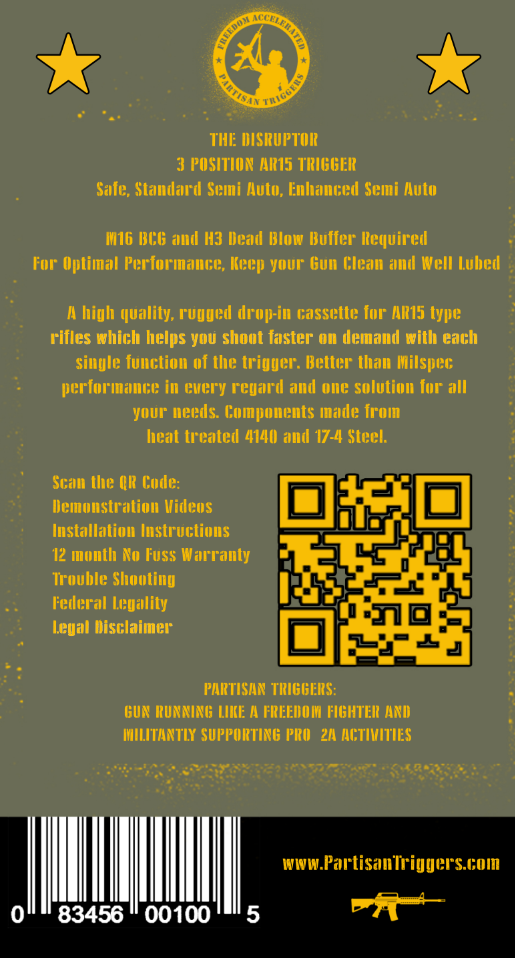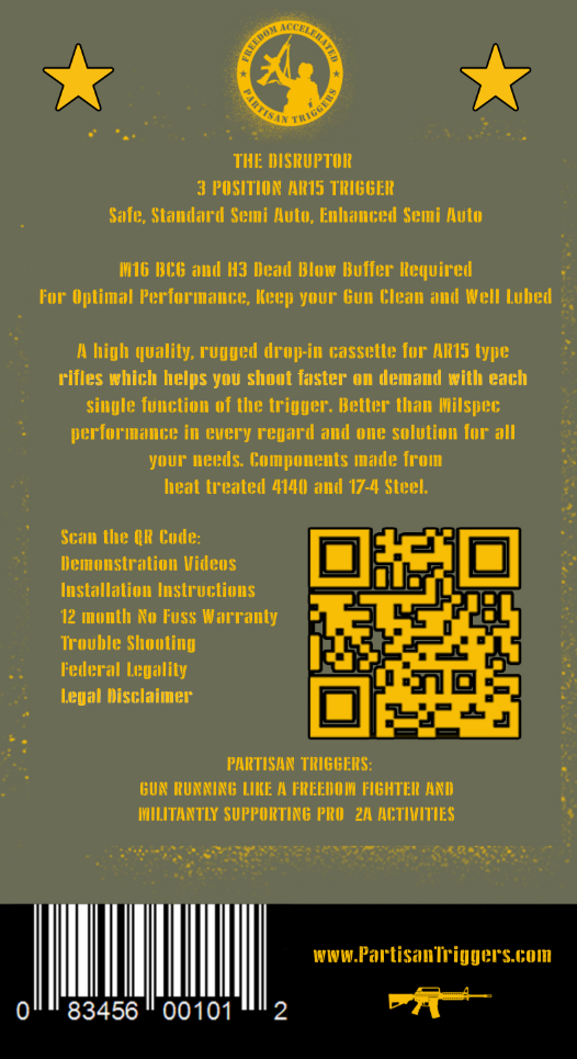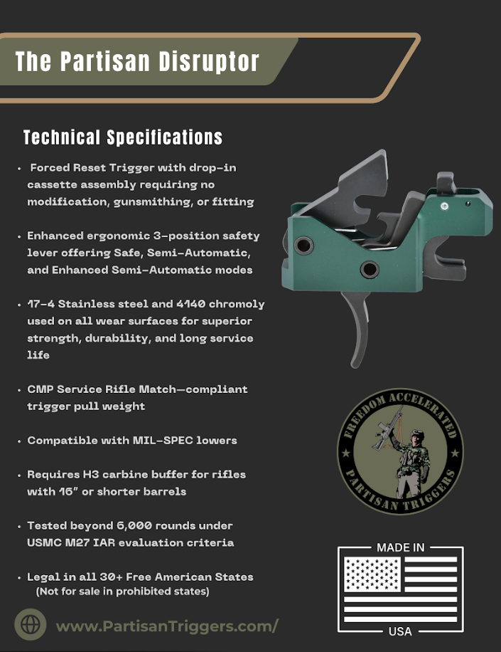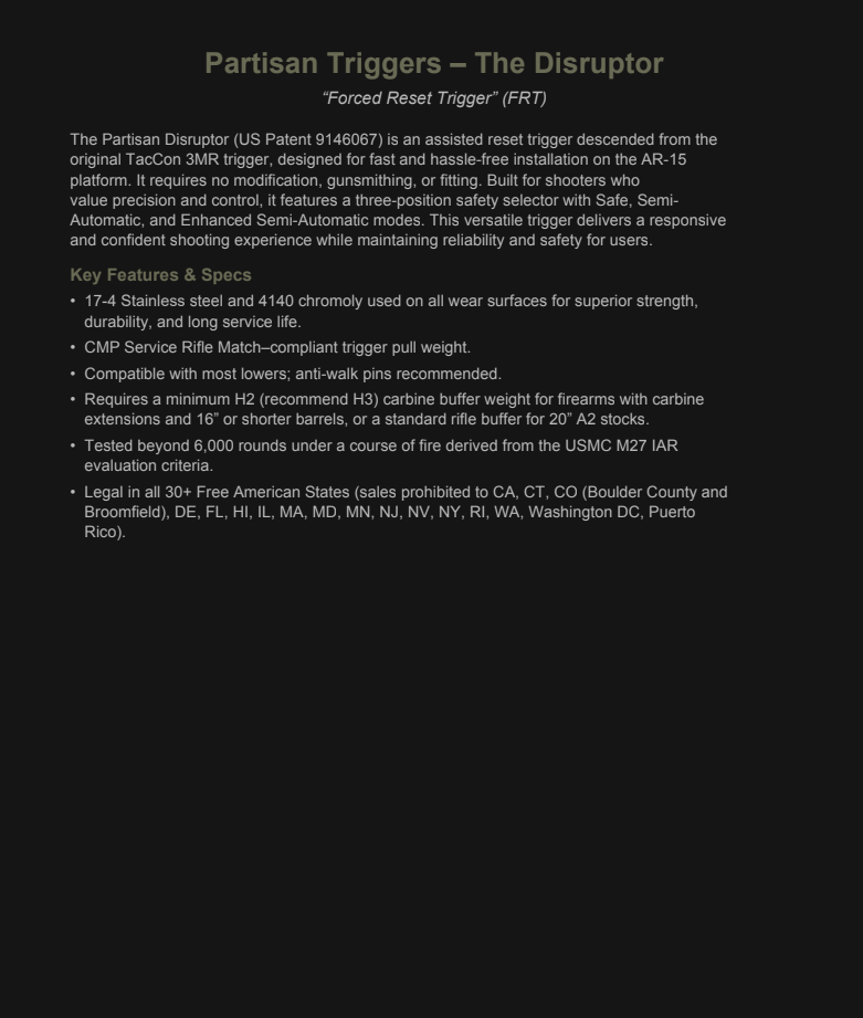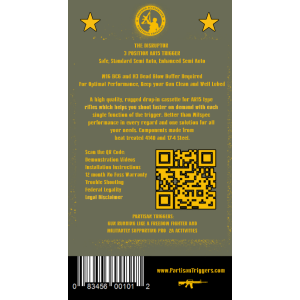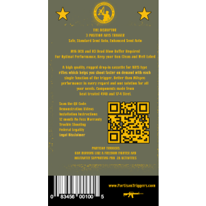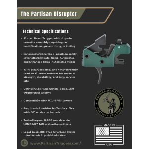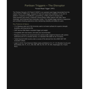 The Partisan Disruptor is an assisted reset trigger descended from the original TacCon 3MR trigger, designed for fast and hassle-free installation on the AR-15 platform. It requires no modification, gunsmithing, or fitting. Built for shooters who value precision and control, it features a three position safety selector with Safe, Semi Automatic, and Enhanced Semi-Automatic modes. This versatile trigger delivers a responsive and confident shooting experience while maintaining reliability and safety for users.