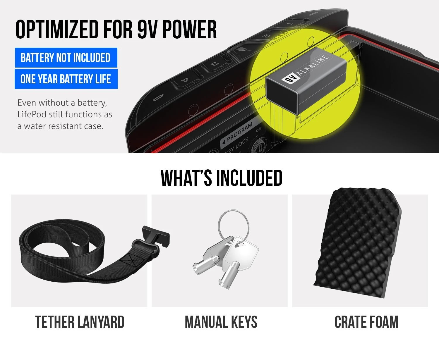Integrating Vaultek’s precisionengineered safe technology and anti-impact latch design, the built-in lock allows you to quicklysecure the LifePod for added security when needed. The backlit LED capacitive keypad is touchactivated, and provides entry of the master code and features quick press to lock action whenlocking. Vaultek engineered a proprietary material blend to provide lightweight characteristicswith superior strength for the ultimate in impact protection. Dualside compression latchescombine with an interior rubber gasket to seal off the interior from environmental factors.LifePods are water resistant with an IP-65 environment rating, airtight, dust proof, and float inwater when loaded with up to 2lbs of weight. Powered by a 9V alkaline battery (notincluded),with a battery life of up to one year under normal use. LifePods do not require abattery to function as a weather resistant case, but a battery is required to enable the built-inlock system. The keypad features a battery status indicator for easy battery monitoring. Anintegrated micro-USB port is located beneath the front rubber cover can power the unit in theevent of a dead battery. Two backup manual keys are included, and the tumbler lock has a KeyLock to disable the lock and prevent LifePod from being picked open. Great for outdoorrecreational use, travel, and even firearm storage for handguns up to 7.75” in length. Meets TSAguidelines. Included accessories are a removable tether lanyard for quick tethering around afixed object and (2) back up manual keys.Exterior Dimensions: 10.25" x 7" x 2.25”.InteriorDimensions: 7.75" x 6" x 1.75”. Weight: 2lbs 3oz.•Rugged protection with a BUILT-IN LOCK SYSTEM. Integrating Vaultek’s precision engineeredsafe technology and anti-impact latch design, LifePods feature a built-in lock allowing you toquickly secure the LifePod for added security when needed.•TOUCH ACTIVATED KEYPAD. A unique backlit LED capacitive keypad provides entry of themaster code and quick press to lock action when locking.•Vaultek engineered a proprietary material blend to provide LIGHTWEIGHT characteristics withSUPERIOR STRENGTH for the ultimate in impact protection.•DUAL SIDE COMPRESSION LATCHES combine with an inner rubber gasket to seal off theinterior from environmental factors. LifePods are water resistant with an IP-65 environmentrating, airtight, dust proof, and float in water.•Can be used without a batteryand still function as a water resistant case. Powered by a 9Valkaline battery (not included) with a battery life of up to one year under normal use. The frontrubberkeyholecover disguises an integrated micro-USB port to power the unit in case of adeadbattery.A unique KEY LOCK FEATURE can beenabled from the interior to disable thefront keyway and prevent the lock from being picked open.