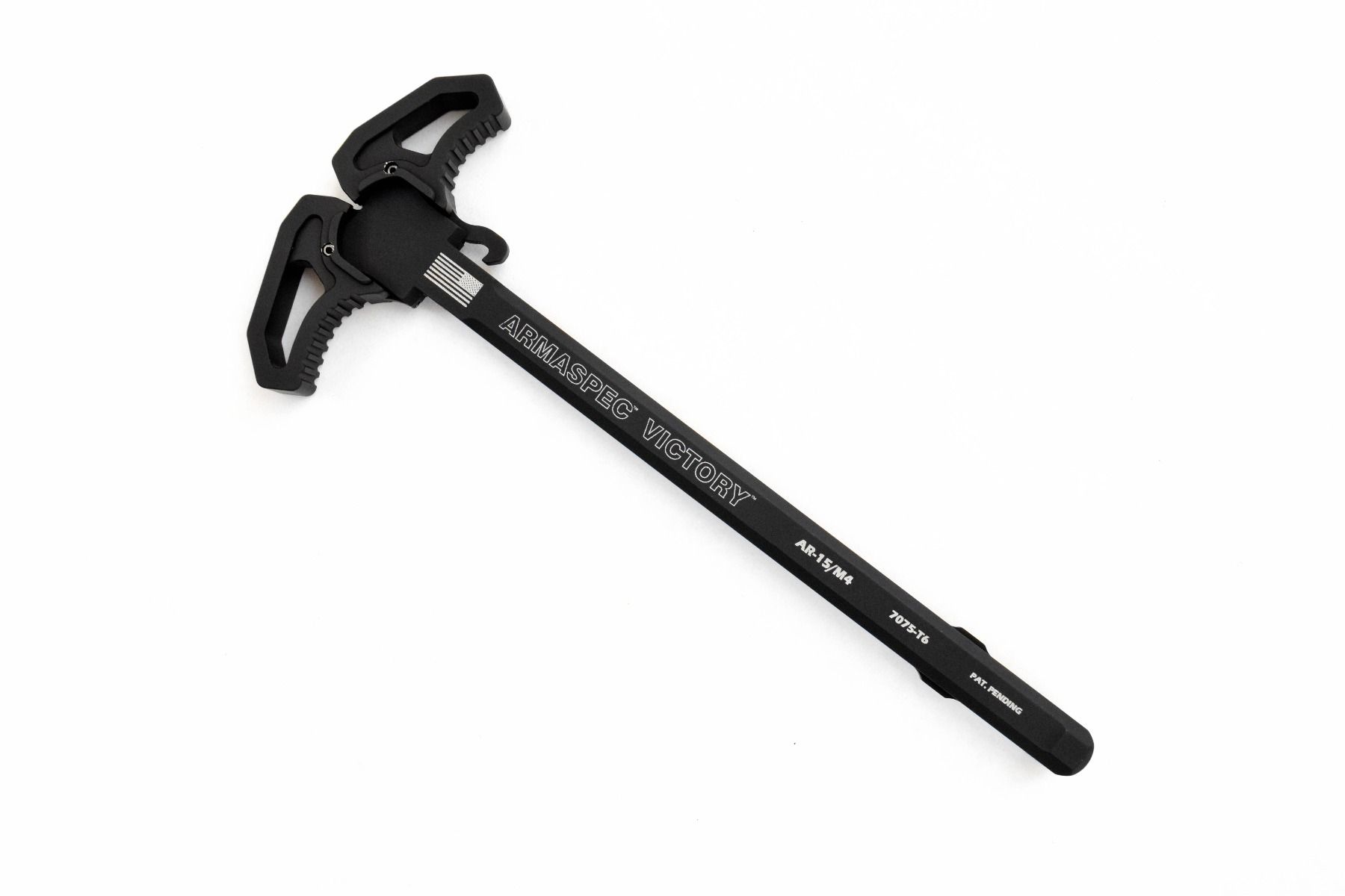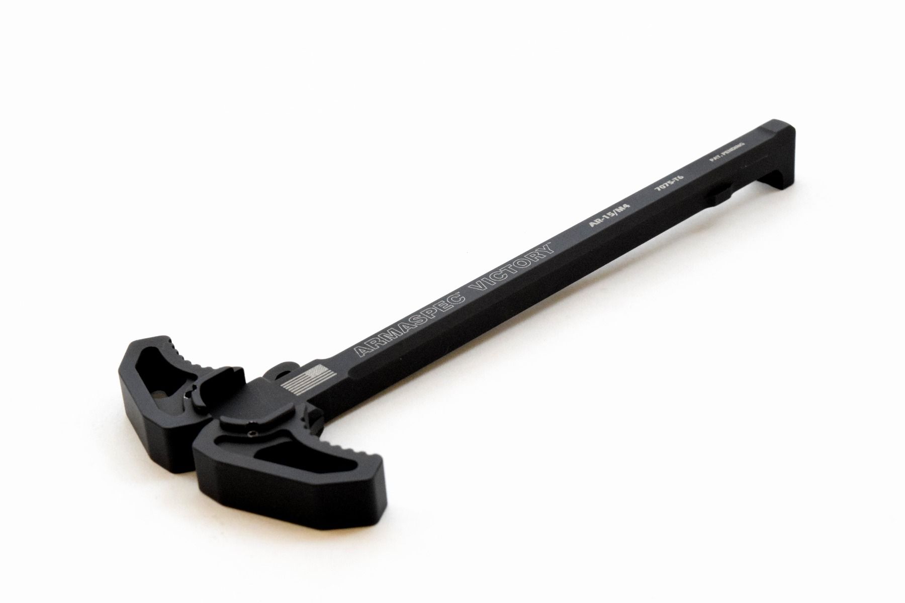 The Armaspec VictoryTM ambidextrous charging handle designed for the 5.56/.223 rifle or pistol. With curved handles for hands free charging, integrated vents ports to route captured gas downward away from the face , and center force charging to reduce shaft twisting. Made from 7075-T6 aluminum and hard black anodized. Patents Pending.