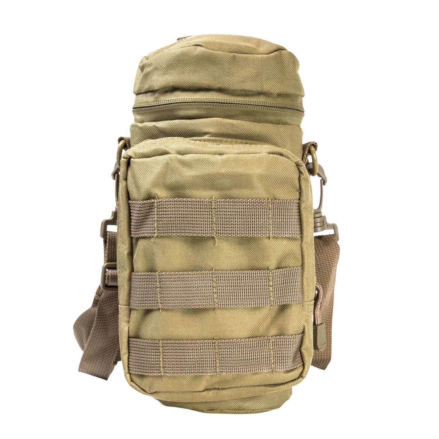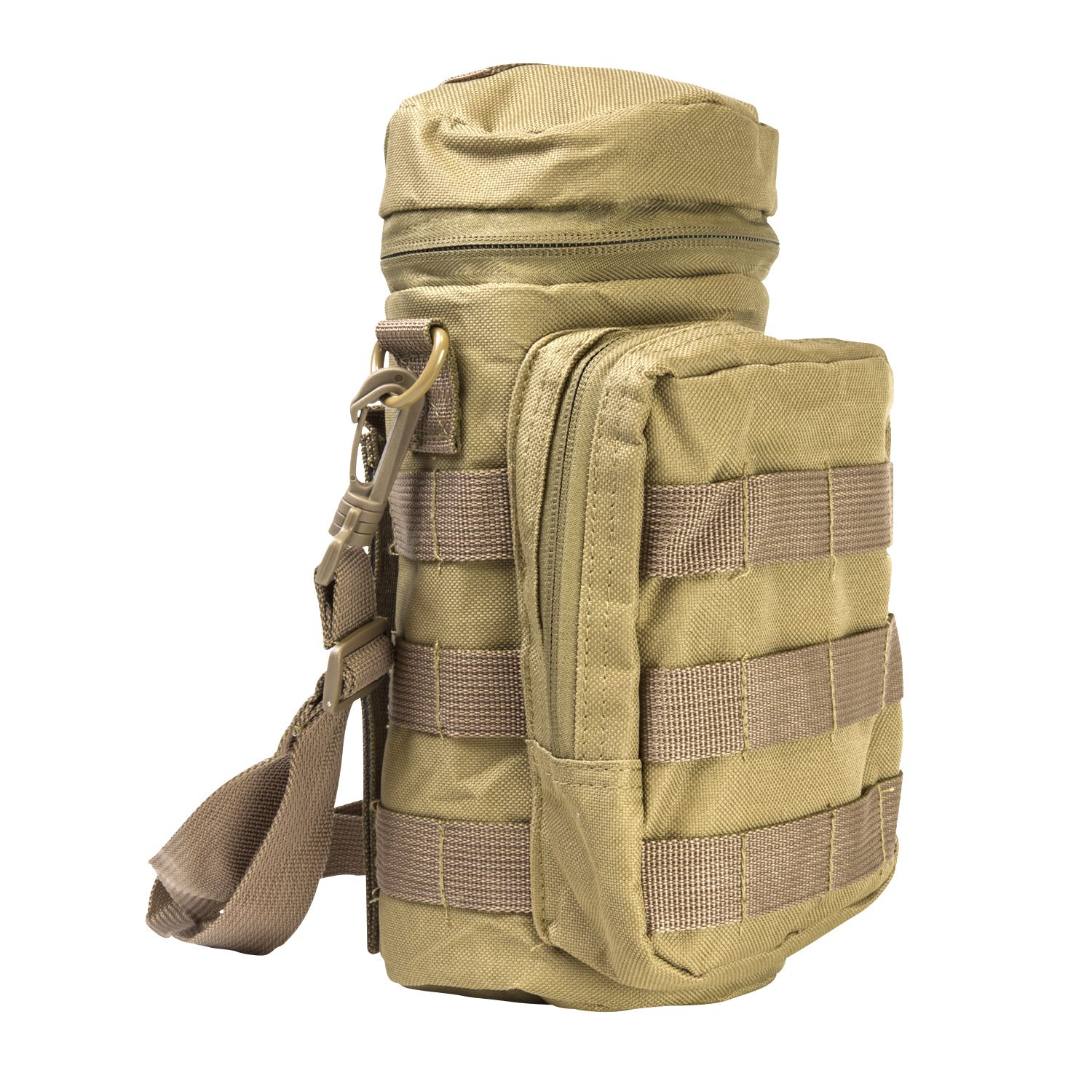 - The New VISM MOLLE Hydration Bottle Carrier will hold up to 32oz. bottles. Zippered top lid and a pass through hatch for drinking tubes. Three rows of MOLLE webbing completely around the Hydration Bottle Carrier. Drain Grommet located on the bottom of the Bottle Compartment.