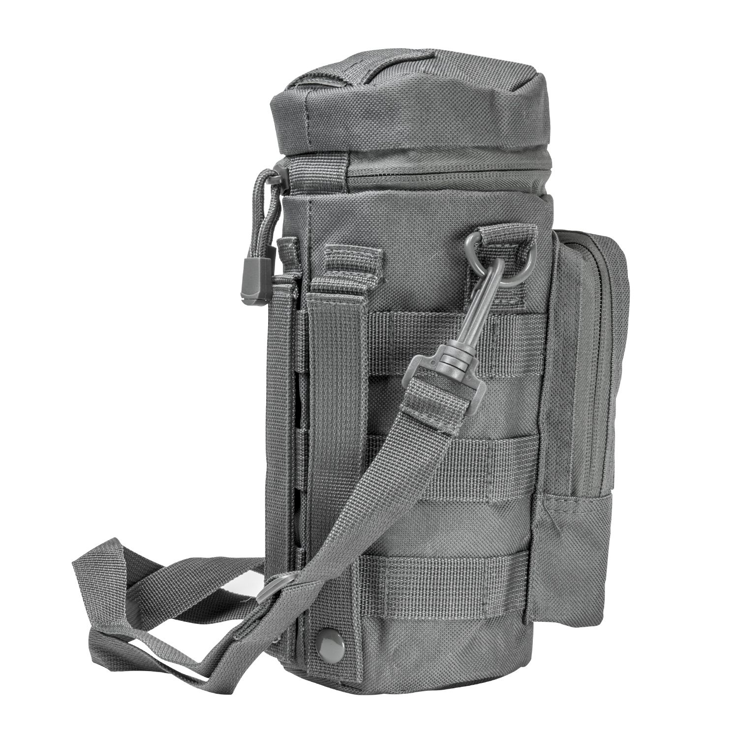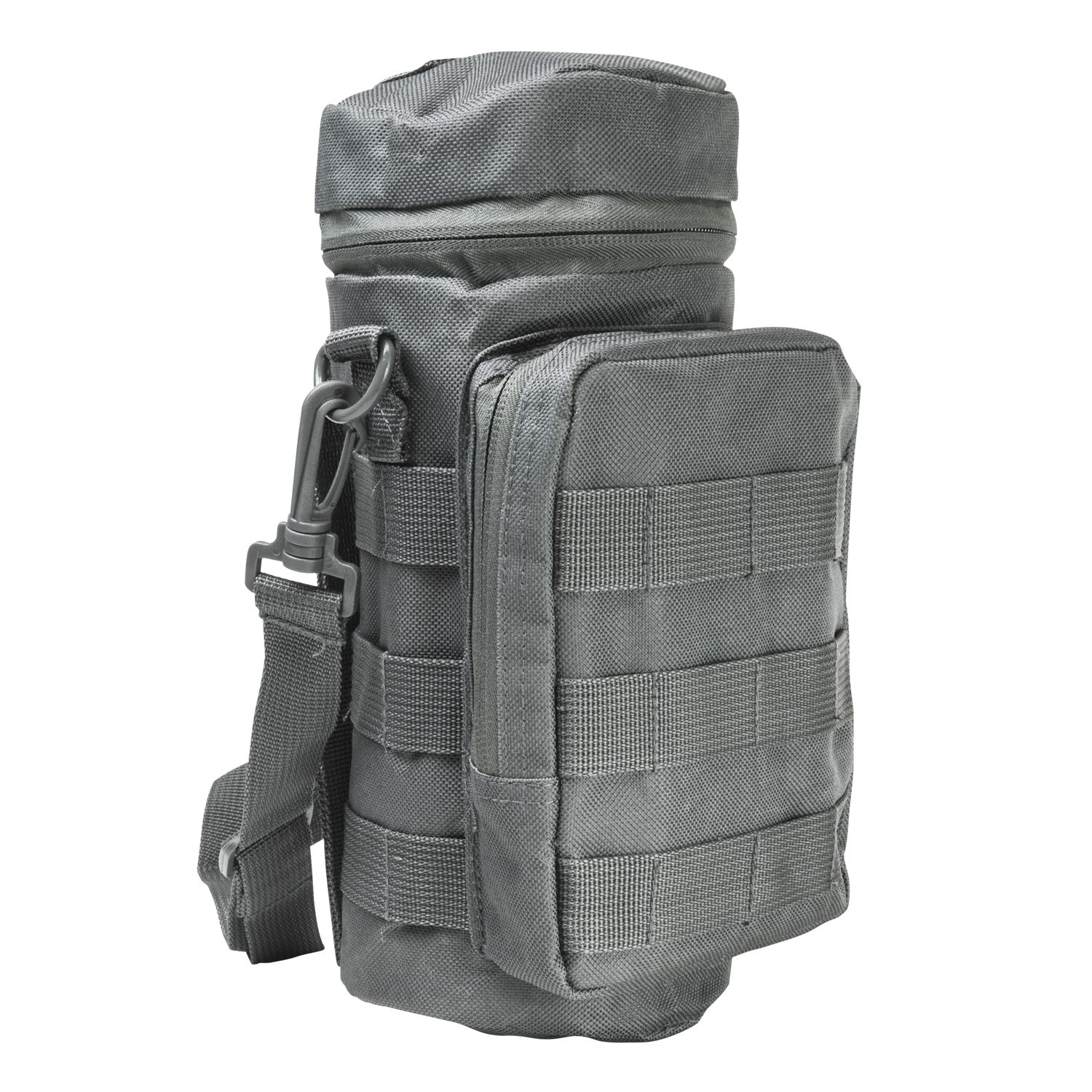 - The New VISM MOLLE Hydration Bottle Carrier will hold up to 32oz. bottles. Zippered top lid and a pass through hatch for drinking tubes. Three rows of MOLLE webbing completely around the Hydration Bottle Carrier. Drain Grommet located on the bottom of the Bottle Compartment.