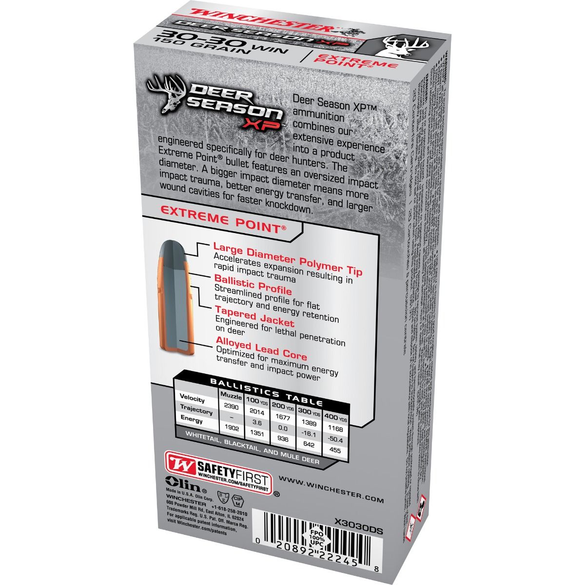 Deer Season XP ammunition combines their extensive experience into a product engineered specifically for deer hunters. The Extreme Point bullet features an oversized impact diameter. A bigger impact diameter means more impact trauma, better energy transfer, and larger wound cavities for faster knockdown.